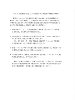 本学では、標記入学試験の際に、新型インフルエンザに感染し、又は、その疑いが あり、受けることができなかった受験者に対し、受験の機会を確保するため、追試験 を実施いたします。 該当することとなった方は、電話にてご連絡ください。 |