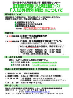 平成22年度認定看護師教育課程(がん化学療法看護コース)についての 入試等個別相談を申し受けます。 | ・入学試験に関すること。 ・学習環境や生活に関すること。 ・臨地実習に関すること。 | | その他、何でもお気軽にご相談ください。 |