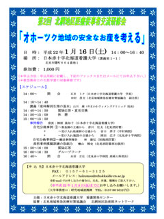 | | 1.日 時 | 平成22年1月16日(土) 14:00 〜 16:40 | | 2.場 所 | 日本赤十字北海道看護大学 (北見市曙町664番地1) | | 3.テーマ | オホーツク地域の安全なお産を考える | | 4.参加費 | 1,000 円 | | 5.申込み・問合わせ先 | | 日本赤十字北海道看護大学 研究地域連携課 電話 0157-66-3311 | | 6.詳 細 | 下記のとおり |