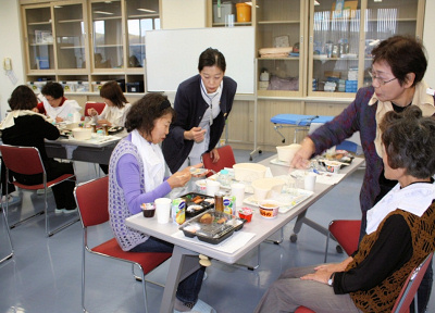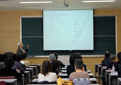 参加者は26名で、午前中は、谷井教授による「老年期の発達」に関する講義を、午後からは、長谷部教授による「食事介助の基本技術について」の演習を行いました。箸での援助や水の含ませ方などは、想像していたよりも難しい部分もあったようで、驚きの声や質問も多く聞かれたところであります。