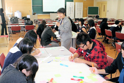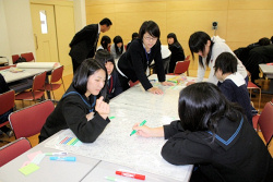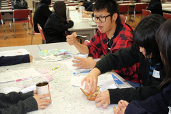 最初にグループごとで北見の市街地図を囲み、地震が起こったときの危険箇所や避難場所を探して地図に印をつけました。次に、避難の時の怪我や食料の調達に役立つように、病院やコンビニエンスストアなども探して印をつけました。災害弱者のお年寄りや、障害のある方、子どもや妊婦さんなどが多くいる場所も探しました。