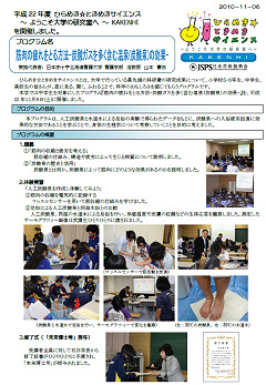 本学では中学生を対象にしたプログラム『筋肉の疲れをとる方法-炭酸ガスを多く含む温泉(炭酸泉)の効果-』を、平成22年11月6日(土)に開催しました。