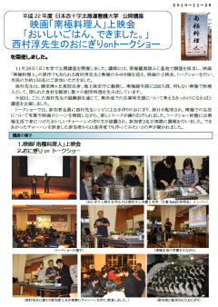11月28日(日)本学で公開講座を開催しました。講師には、南極観測隊ふじ基地で調理を担当し、映画「南極料理人」の原作でも知られる西村淳先生と奥様のみゆき様を迎え、映画の上映会、トークショーを行い、市民の方約150名にご参加いただきました。
