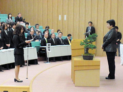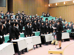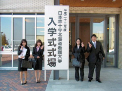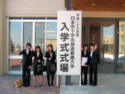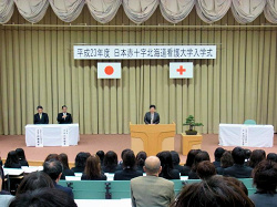 4月5日(火)、爽やかな青空のもと、看護学部看護学科106名並びに大学院看護学研究科3名、合わせて109名を迎えて、本学の平成23年度入学式が執り行われました。 河口てる子新学長はじめ来賓の方々からの激励を受け、新入生たちは緊張した面持ちで聞き入っていました。 3月11日に起きた東日本大震災により、日本全体が混迷した中での平成23年度の始まりとなりましたが、新入生の皆さんは本学での学びを通して、いかなる困難にも立ち向かう力を養っていっていただきたいです。