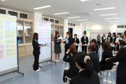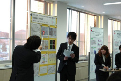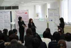 その内容は、アンケート調査によるもの、インタビューによるもの、文献検討、実験研究など、多彩なテーマで論文を仕上げていたようです。発表はポスター形式で、5分の発表時間と2分の質疑応答時間が設けられました。1〜3年生も発表を聞きに訪れており、4年生の発表を興味深く聞き、時折、質問を投げかける場面も見られました。