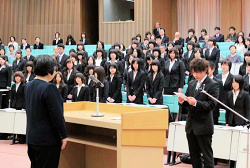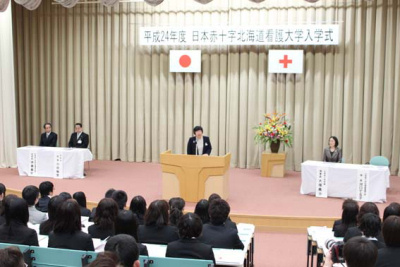 河口学長からは、看護職者の道を選ばれた入学生に対し、「人が人をケアするためには、看護技術に心をのせて運ぶことを学んでいただきたい」、「一生懸命努力すると次の展開が見えてくる。色んなことにチャレンジをしていただきたい」との言葉があり、その後、来賓の方々からの激励のお言葉をいただき、入学生の皆さんは緊張した面持ちで聞き入っていました。