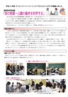 本学では、独立行政法人科学技術振興機構の支援事業である平成24年度の「サイエンス・パートナーシップ・プロジェクト(SPP)」として採択された講座型学習活動「命の制御・心臓の働きを科学する」を、本講座の連携機関である北見北斗高等学校、北見柏陽高等学校、北見緑陵高等学校から多くの学生の参加を得て開催いたしました。