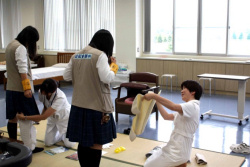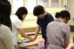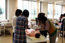 参加者の皆さんは、講堂での教育概要、キャンパスライフ、入試概要の説明を聞いた後、模擬授業、実習モデルを使った看護体験、妊婦体験、患者疑似体験などの実体験コーナー、進学相談、在学生対談等の各コーナー・施設等を自由にまわり、大学生活、看護への興味を深めていたようです。