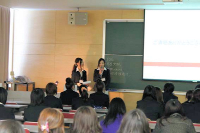 その内容は、アンケート調査によるもの、インタビューによるもの、文献検討、実験研究など、多彩なテーマで論文を仕上げていたようです。発表は、パワーポイントにより行われ、5分の発表時間と2分の質疑応答時間が設けられました。1年生〜3年生も発表を聞きに訪れており、4年生の発表を興味深く聞き、時折、質問を投げかける場面も見られました。